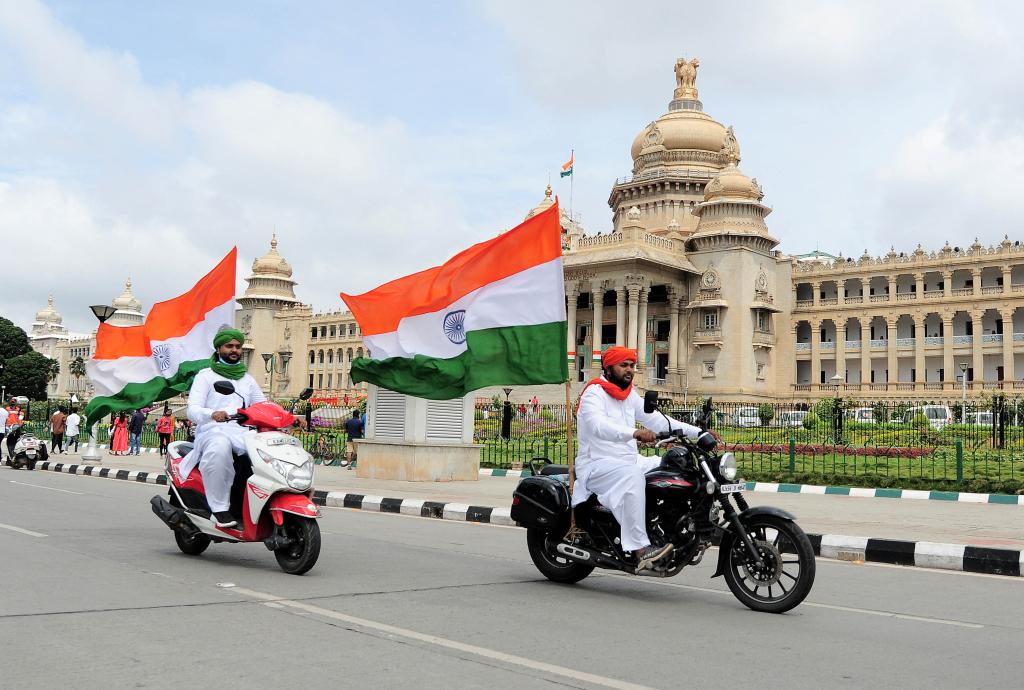 2021年8月15日,人们在印度班加罗尔展示印度国旗,庆祝独立日。新华社发