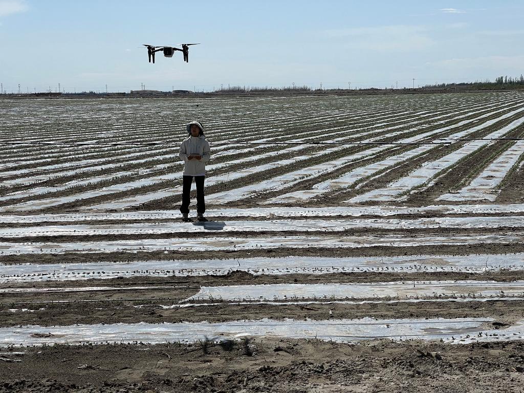 莫晓钰操作遥感无人机监测棉花出苗率。(受访者供图)