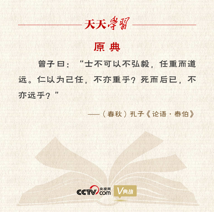 “士不可以不弘毅,任重而道远”是《论语·泰伯》中曾子说的一句话。曾子,名参,是孔子弟子之一,在儒学发展史上占有重要地位,被后世尊奉为“宗圣”。曾子告诉我们,作为一个士人,必须志向远大,意志坚强,因为他深知自己责任重大,需要长期艰苦奋斗。朱熹《四书集注》解释说:“非弘不能胜其重,非毅无以致其远。”因此,弘而不毅,固难持久;毅而不弘,则气量褊狭;既弘且毅,方能任重道远。