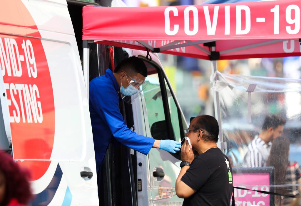5月17日,一名男子在美国纽约时报广场接受新冠病毒检测。新华社记者王迎摄