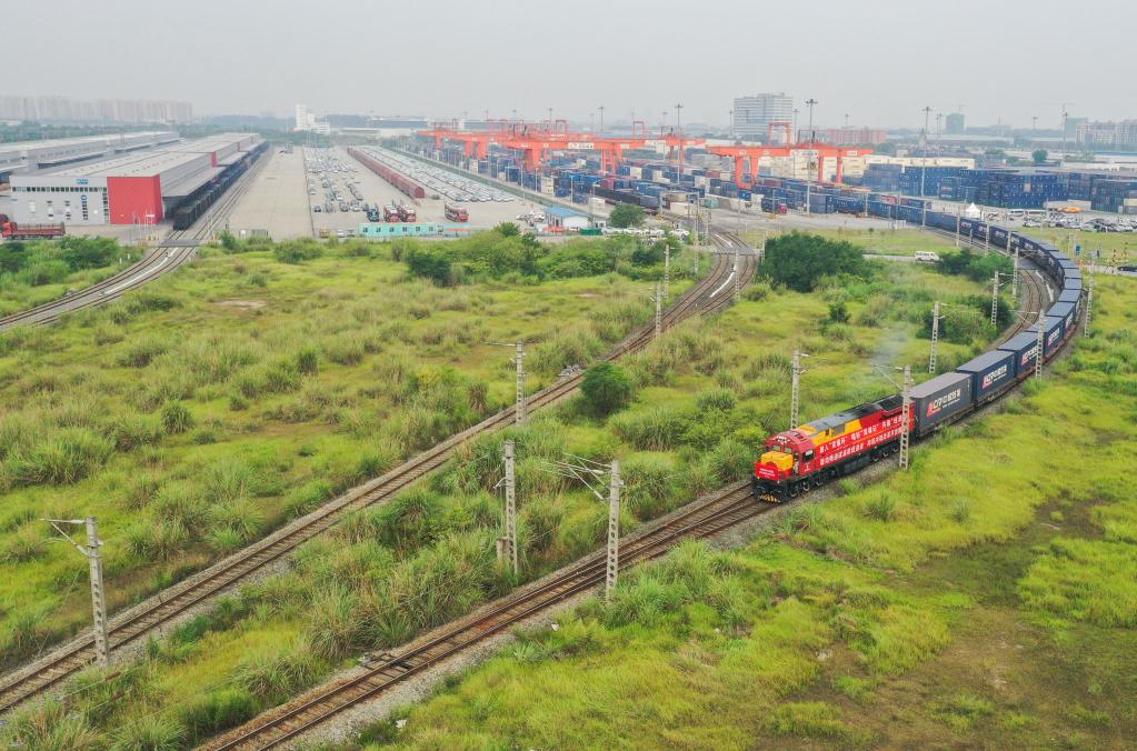 6月30日,中欧班列(成渝)列车从成都国际铁路港驶出(无人机照片)。新华社记者 王曦 摄