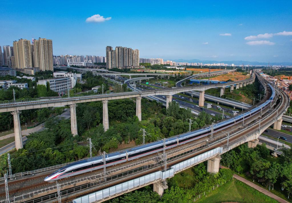 6月24日,一辆复兴号动车组列车行驶在位于成都市境内的成渝城际铁路上(无人机照片)。新华社记者 王曦 摄