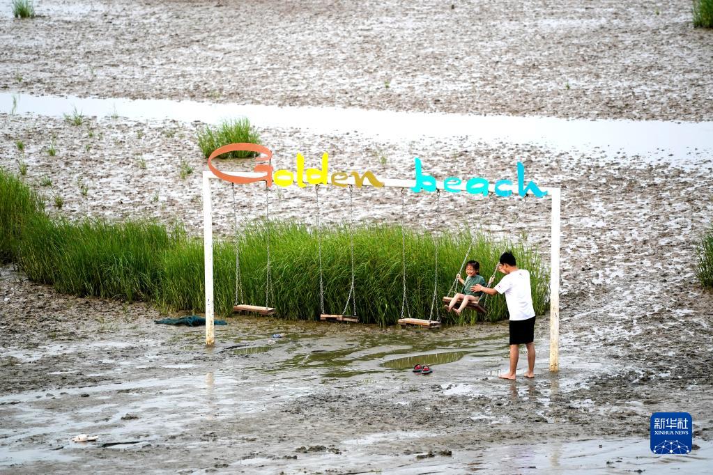 游人在江苏省启东市黄金海滩景区内的黄海滩涂上休闲娱乐(2022年7月16日摄)。新华社记者 季春鹏 摄