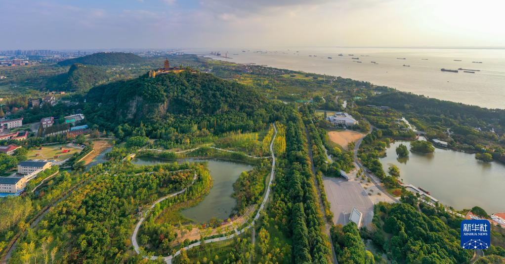 这是江苏省南通市狼山国家森林公园沿江景色(2021年10月25日摄,无人机照片)。新华社记者 李博 摄