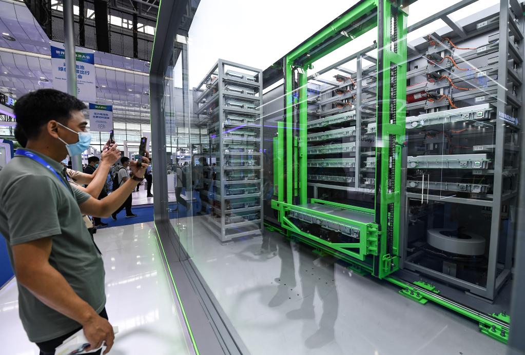 7月21日,在2022世界动力电池大会动力电池绿色低碳出行展览会上,观众在用手机录制电动汽车换电过程。 新华社记者 王曦 摄
