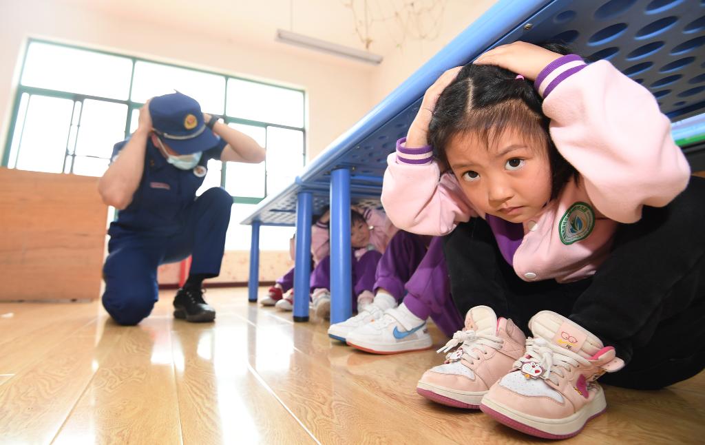 2022年5月11日,贵阳市南明区绿苑阳光幼儿园的小朋友在消防员的指导下学习防灾减灾自救技能。新华社发(赵松 摄)