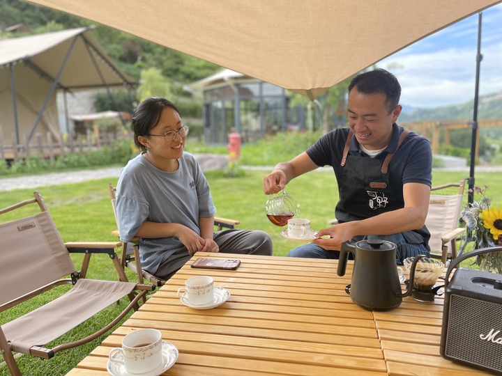 35岁的晋探宇是野三坡景区可野露营基地负责人,曾在北京从事旅游相关工作多年。2021年7月,晋探宇回到家乡,创办了这个露营基地。