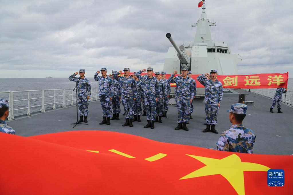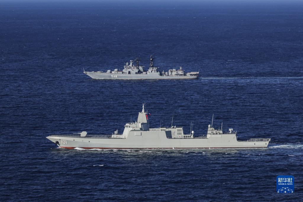 在中俄“海上联合-2021”军事演习中,南昌舰(下)与俄方舰艇联合航渡(2021年10月15日摄)。新华社发(王游 摄)
