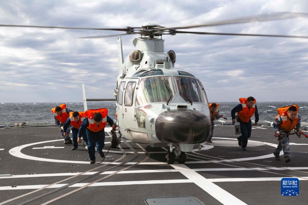 舰载直升机在南昌舰甲板准备起飞(2021年10月16日摄)。新华社发(韩成 摄)
