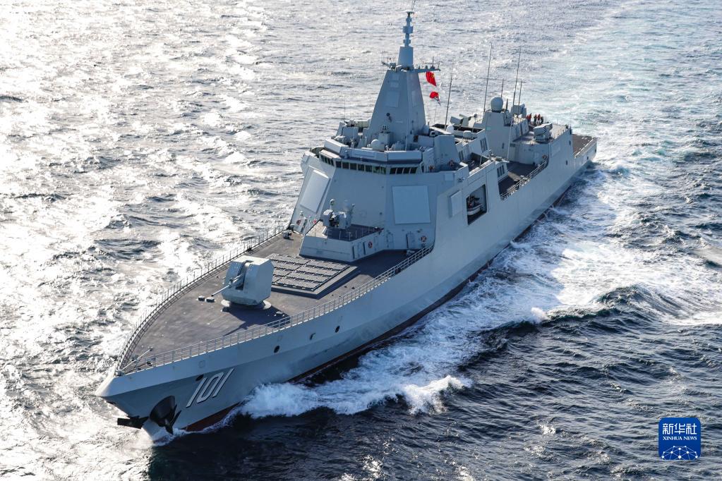 南昌舰作为中国海军参演舰艇编队指挥舰参加中俄“海上联合-2021”军事演习。这是南昌舰在航行(2021年10月15日摄)。新华社发(王游 摄)