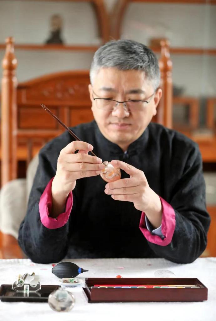 “方寸之内显日月,股掌之上惹人怜。”这句诗形容的就是内画。创作时,画师需要从内径极窄的壶口伸入画笔,在水晶容器磨砂内壁上反向绘画。2006年,衡水内画被列入第一批国家级非物质文化遗产名录。
