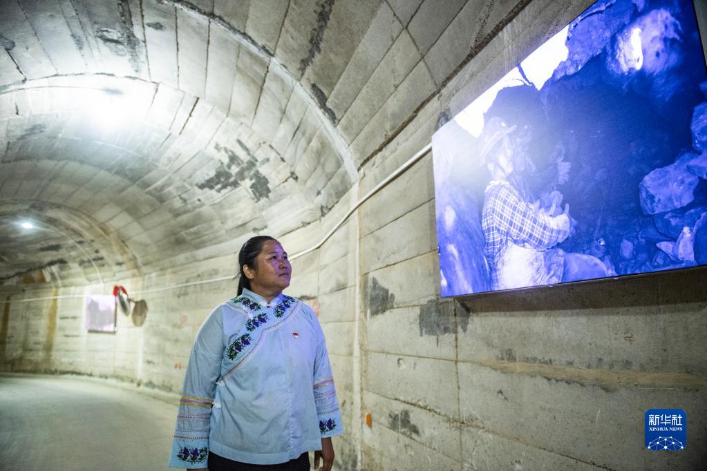 在贵州省罗甸县沫阳镇麻怀村,邓迎香在隧道内看着过去的照片,回忆开山挖洞的情景(2020年8月31日摄)。新华社记者 陶亮 摄