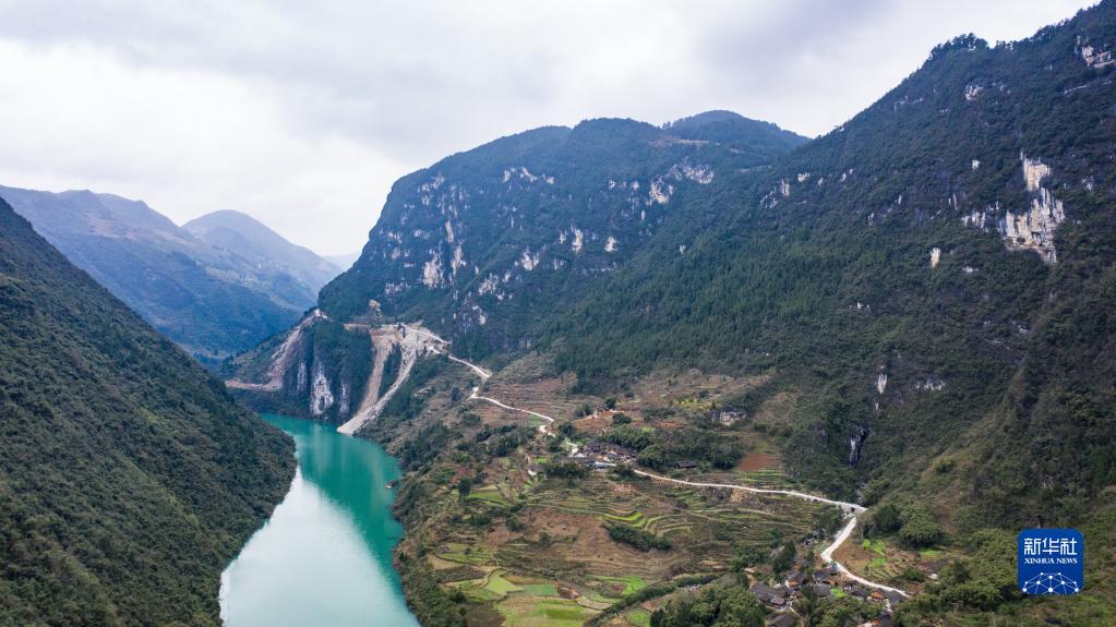 贵州省道真仡佬族苗族自治县忠信镇石笋村的绝壁通组公路(2020年1月15日摄,无人机照片)。新华社记者 陶亮 摄