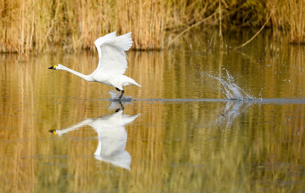 天鹅在乌梁素海水面上嬉戏(2020年10月28日摄)。新华社记者 连振 摄