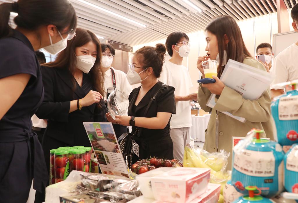 第五届进博会食品及农产品展区、医疗器械及医药保健展区展前供需对接会在国家会展中心(上海)举行。这是对接会嘉宾在参展企业展位前品尝水果(2022年8月30日摄)。新华社记者 方喆 摄