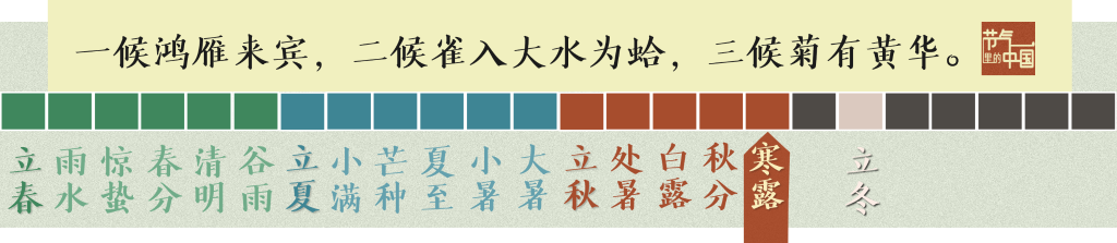 古人根据对大自然的观察,将寒露分为三候:一候鸿雁来宾,二候雀入大水为蛤,三候菊有黄华。此时,北方地区已呈深秋景象,天气日渐寒凉,鸿雁队列大举南迁,雀鸟都不见了,各色各样的菊花普遍开放。