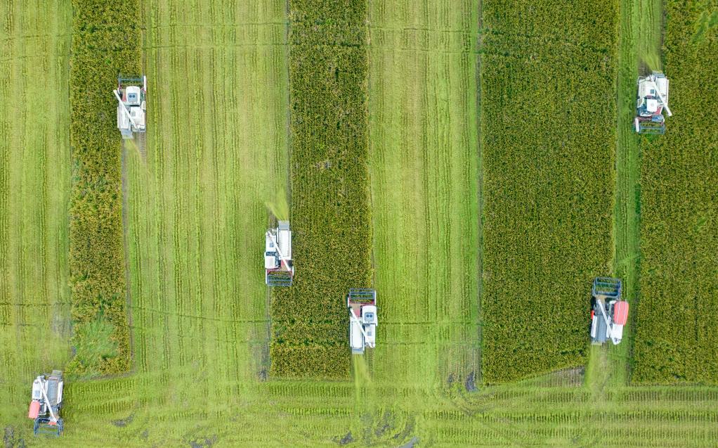 10月3日,在江苏省海安市,农民在驾驶机械收割水稻(无人机照片)。新华社发(翟慧勇摄)