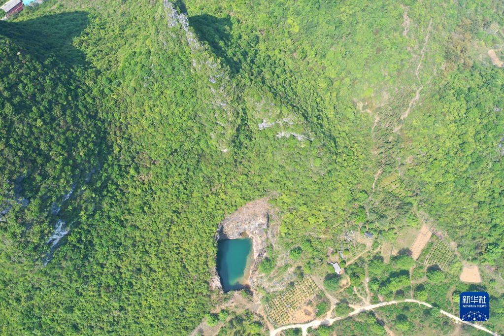 广西桂林市雁山区大埠乡黎家村的一处采石场,经过生态修复,如今裸露的山体已经复绿(2022年4月11日摄,无人机照片)。新华社记者 周华 摄