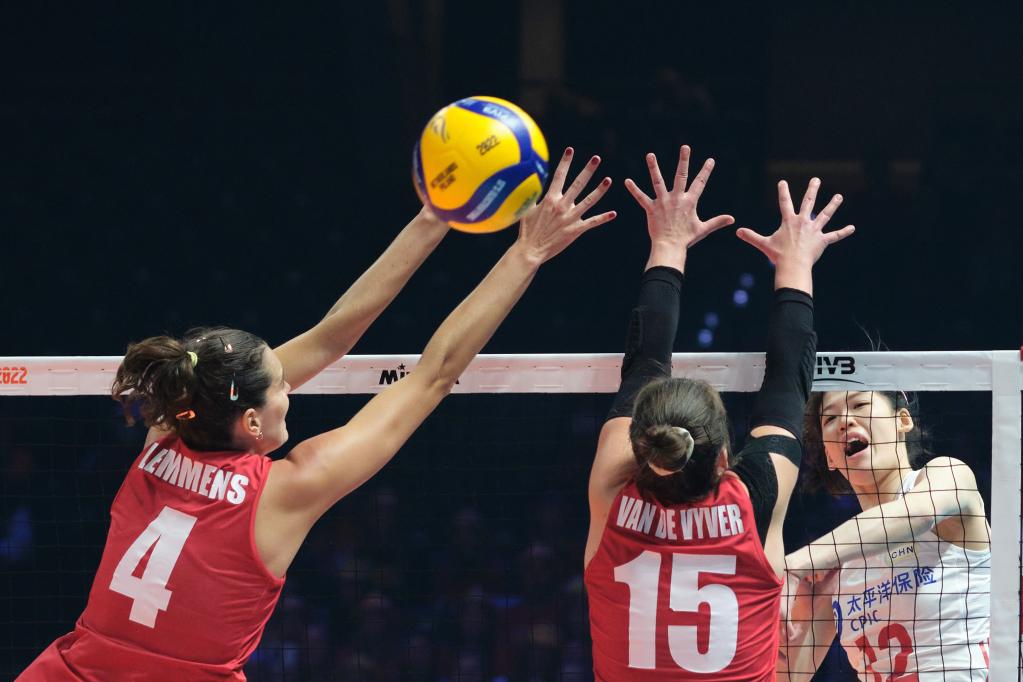 10月9日,中国队球员李盈莹(右)在对阵比利时队的比赛中扣球。新华社记者孟鼎博摄