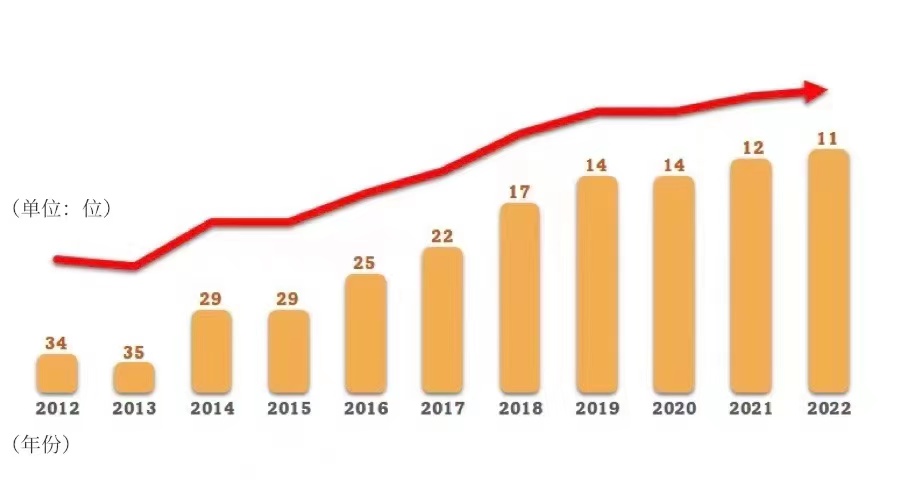 十年来,中国的全社会研发投入与国内生产总值的比例由1.91%提高到2.44%;2021年中国全社会研发经费是2012年的2.7倍,基础研究经费是2012年的3.4倍;据世界知识产权组织发布的《全球创新指数2022》,中国排名从十年前第34名上升至第11名。