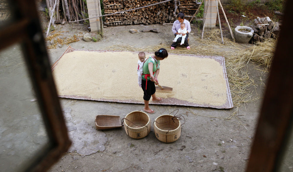 邓丁蓝(下)背着孩子在家门口晒谷子(2011年9月14日摄)。