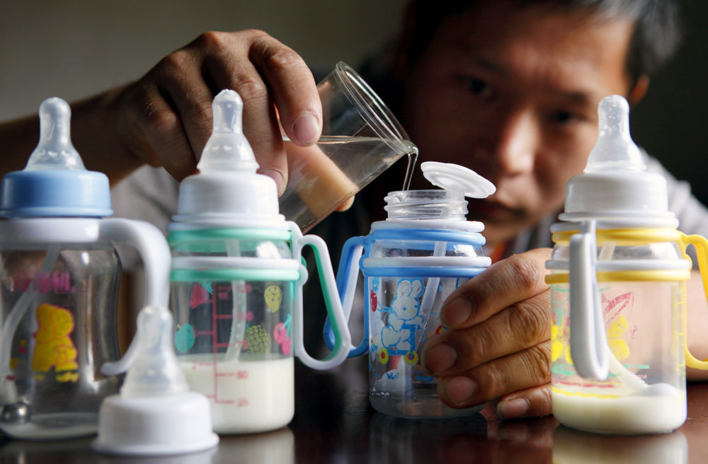 吴年有为四胞胎冲泡牛奶(2011年9月14日摄)。