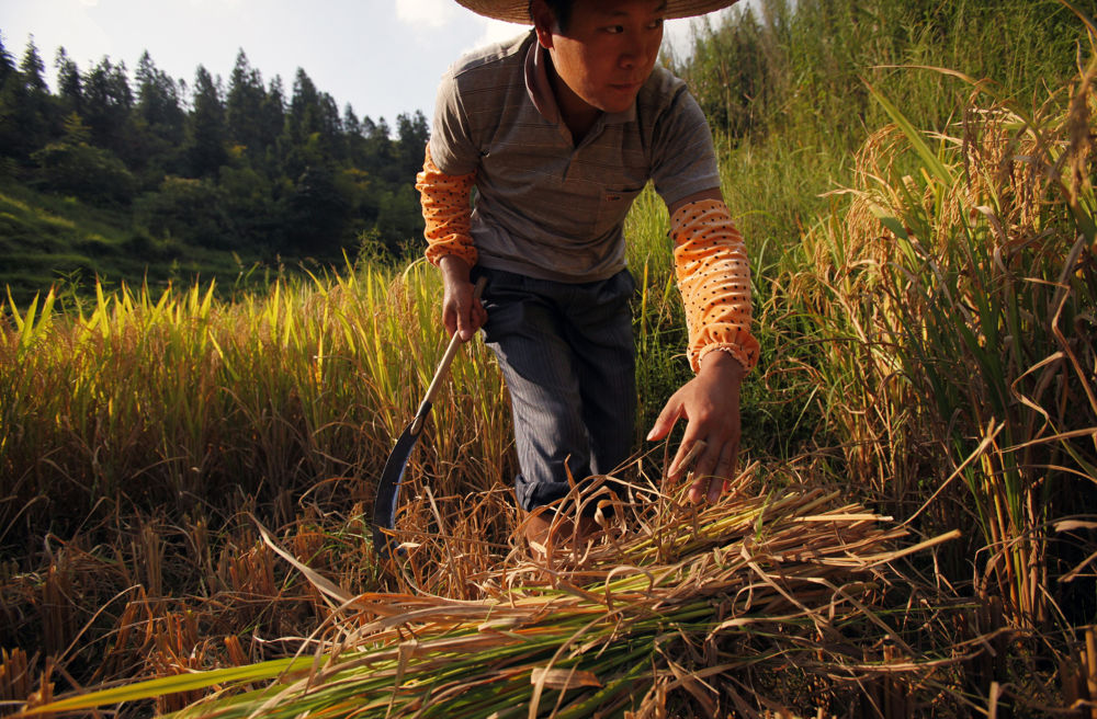四个孩子睡午觉时,吴年有抽空到田里收稻谷(2011年9月14日摄)。