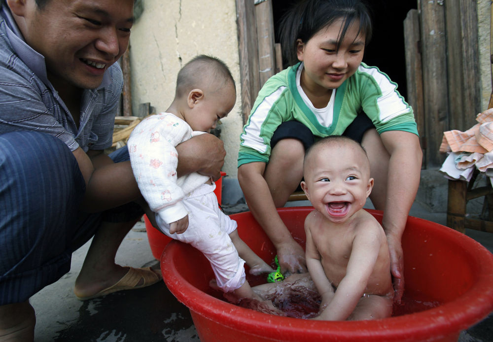 家里只有一个澡盆,小家伙们得轮着洗。一进澡盆她们就拍手嬉笑,这也是吴年有最开心的时候(2011年9月14日摄)。