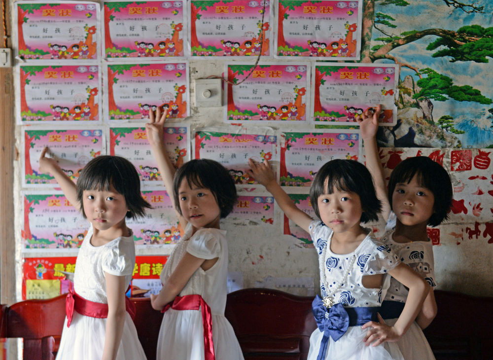 十岁的四胞胎姐妹已经不再那么瘦弱,她们都在乡里的中心小学上学。像其他孩子一样,她们爱吃零食,爱打闹,爱抱怨功课多。姐妹们分在两个班,虽然有时也会选择不一样的衣服去学校,但老师还是经常叫错她们的名字。