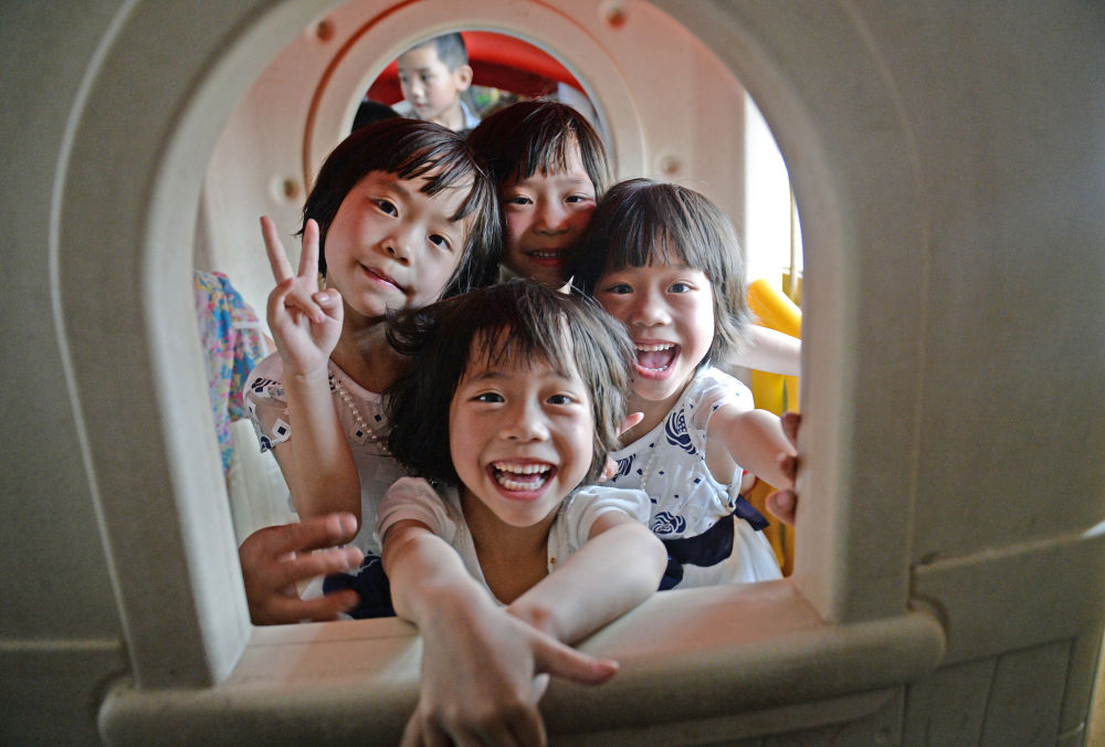 四胞胎姐妹在幼儿园里玩耍(2016年5月25日摄)。