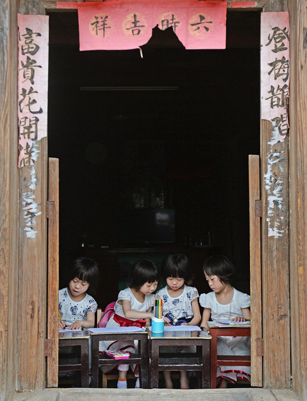 四胞胎姐妹坐在家中土坯房门口画画(2016年5月25日摄)。