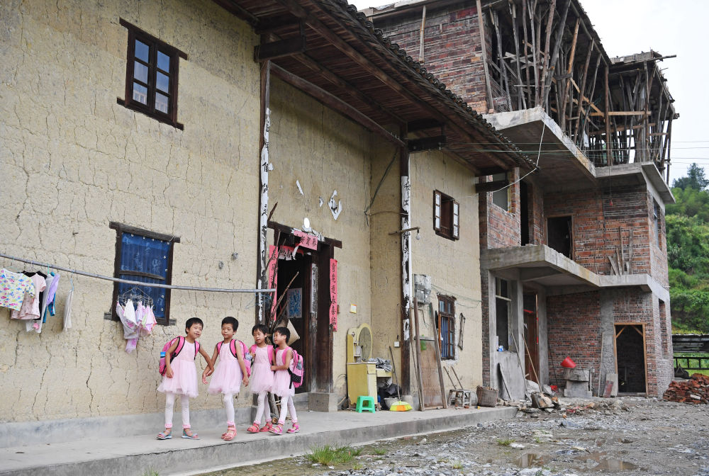 四胞胎姐妹出发去学校,身后是家中在建的三层小楼(2017年9月7日摄)。