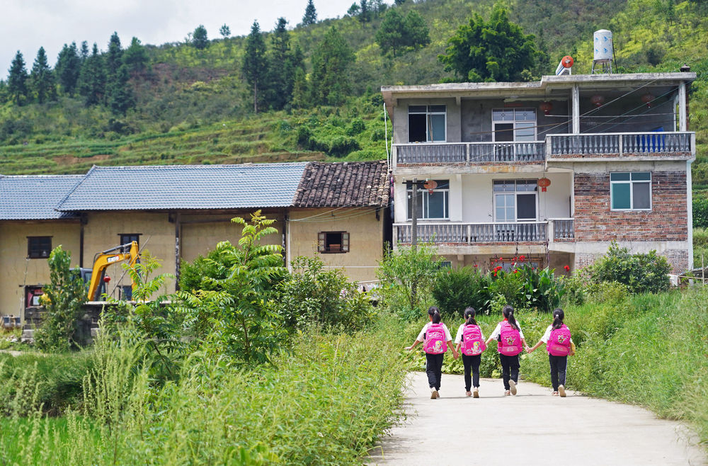 四胞胎姐妹走在放学回家的路上,远处是家里的土坯房祖屋和新建的三层小楼(2020年9月10日摄)。
