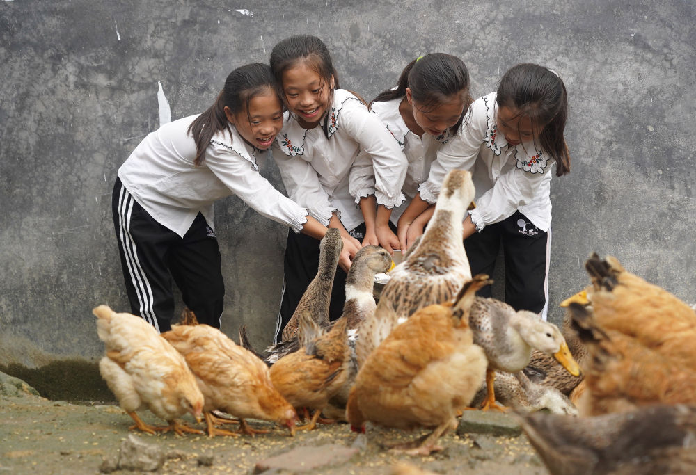 四胞胎姐妹在家里的小院旁给饲养的鸡和鸭喂食(2020年9月10日摄)。