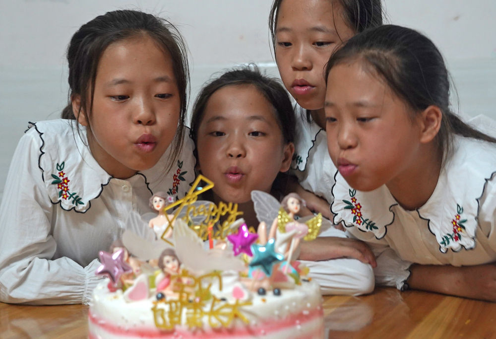 四胞胎姐妹在新家里吹蜡烛过生日(2020年9月10日摄)。