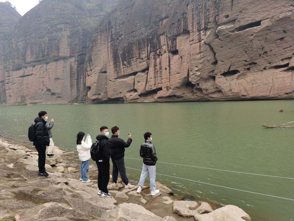 在江西省鹰潭市龙虎山风景区,王俊杰等几名游客在泸溪河畔游玩。新华社记者贾伊宁 摄