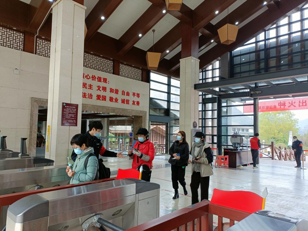 在江西省宜春市明月山温泉风景名胜区,游客在检票口有序入场。(受访者供图)