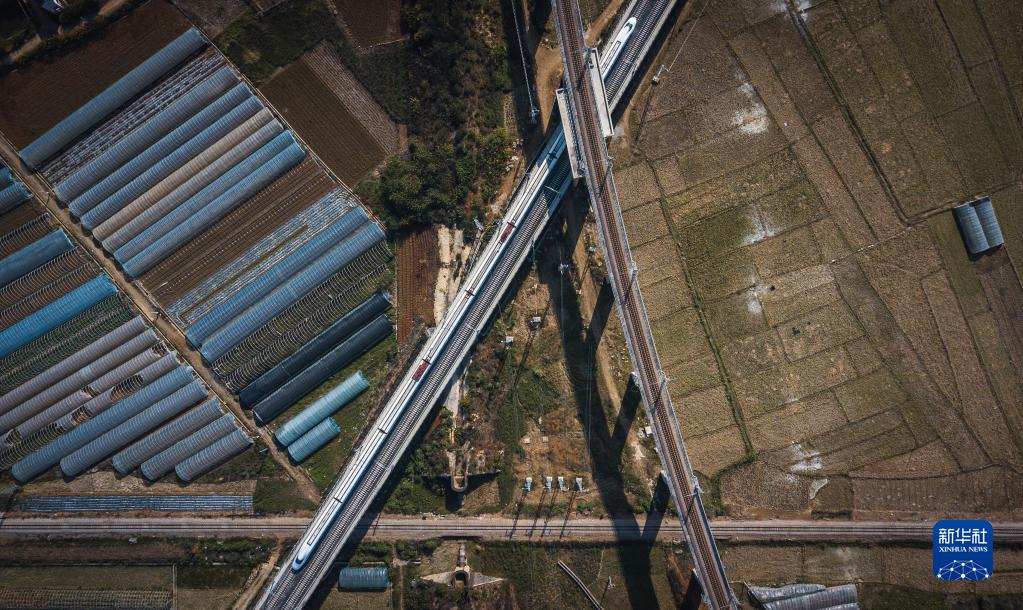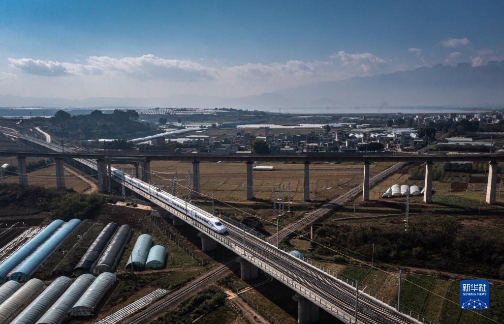 12月16日,列车行驶在与昆玉河铁路(上)、滇越铁路(底层)相互交叉的弥蒙高铁线(中)(无人机照片)。新华社记者 王冠森 摄