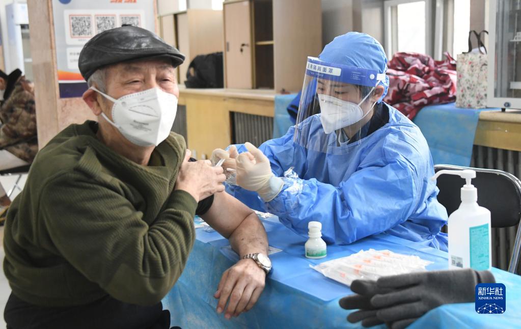 12月15日,在北京市海淀区中关村街道新冠疫苗接种点,医护人员为老年人接种新冠疫苗。新华社记者 任超 摄