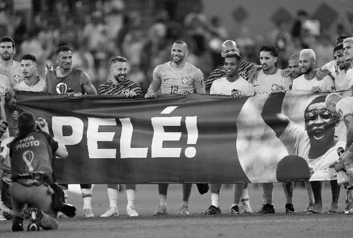 12月5日,参加卡塔尔世界杯的巴西队球员在赛后打出“球王”贝利的横幅。 新华社记者陈诚摄
