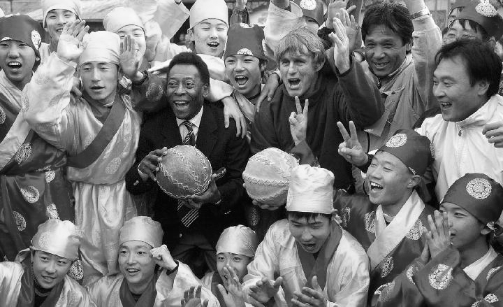 2002年3月16日,贝利访问中国时,与时任中国国家足球队教练的米卢和身着中国宋代服装、参加蹴鞠表演的北京国安足球队小队员们合影留念