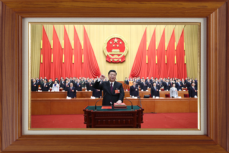 这张照片,是2018年3月17日,习近平当选国家主席、中央军委主席后进行宪法宣誓的场景。自发表2019年新年贺词起,就一直摆在书架上。