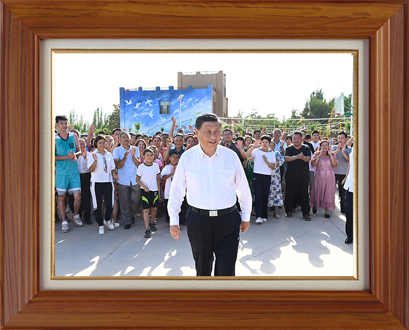 7月14日,习近平总书记在新疆吐鲁番市高昌区亚尔镇新城片区新城西门村考察时,同各族群众在一起。