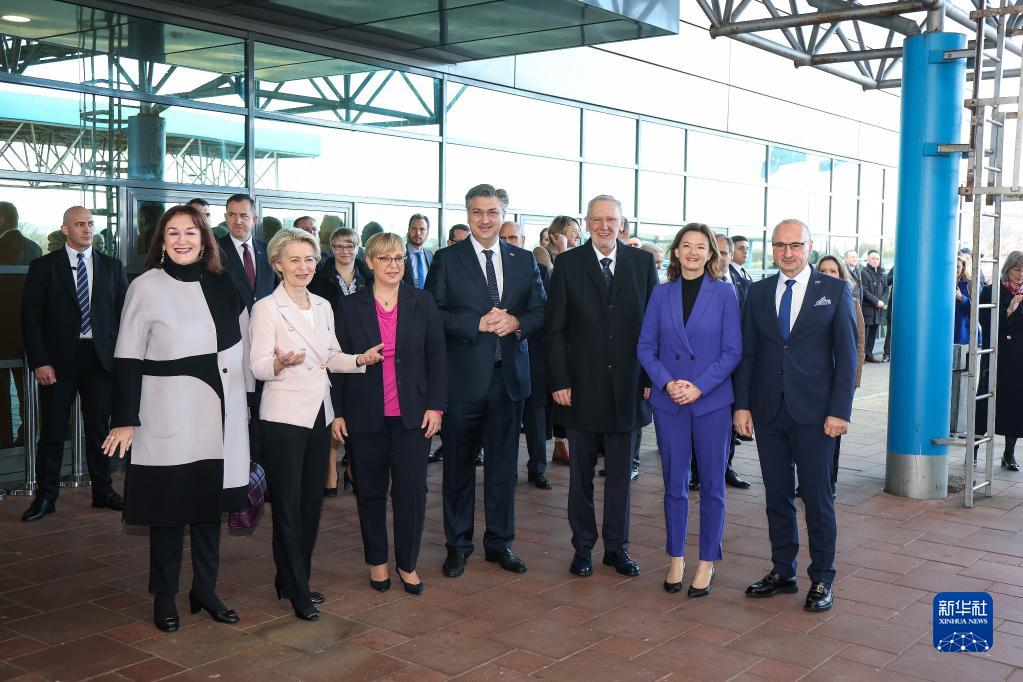 1月1日,在克罗地亚与斯洛文尼亚边境的布雷加纳,欧盟委员会主席冯德莱恩(前排左二)、克罗地亚总理普连科维奇(前排左四)和斯洛文尼亚总统穆萨尔(前排左三)共同庆祝克罗地亚加入欧元区和申根区。新华社发(Pixsell图片社/卢卡·施坦茨尔摄)