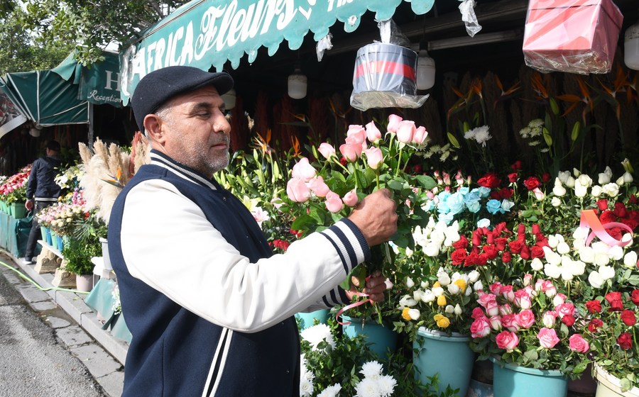 2022年12月29日,突尼斯首都突尼斯市中心一处花市的店主向顾客展示鲜花。新华社发(阿代尔摄)