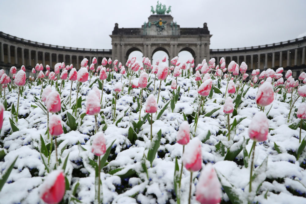 2022年4月1日在比利时布鲁塞尔五十周年纪念公园拍摄的雪中的郁金香。