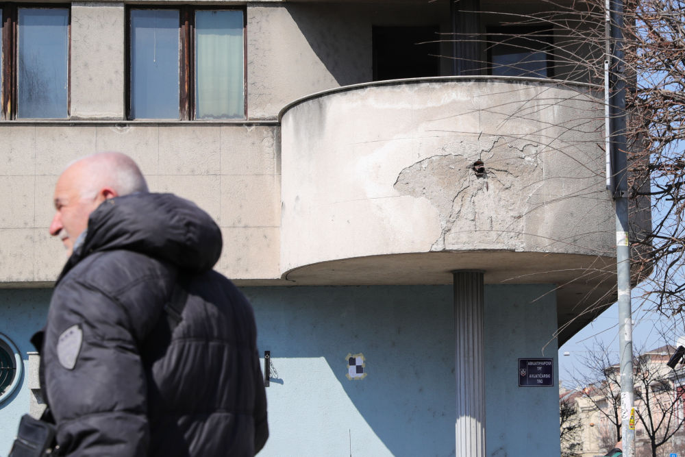 2022年3月21日,行人经过塞尔维亚贝尔格莱德曾经遭受北约空袭的南斯拉夫空军司令部大厦。