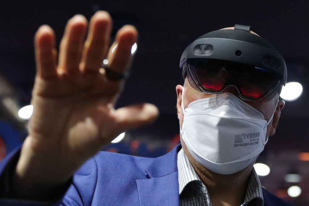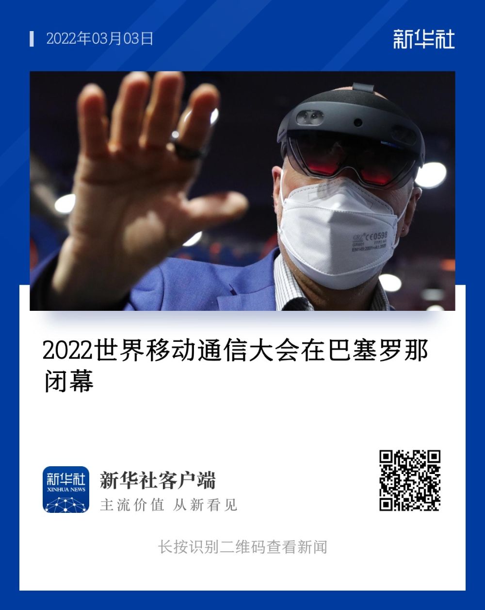 2022年3月3日,一名参观者在西班牙巴塞罗那2022世界移动通信大会的Orange公司展区体验XR技术。