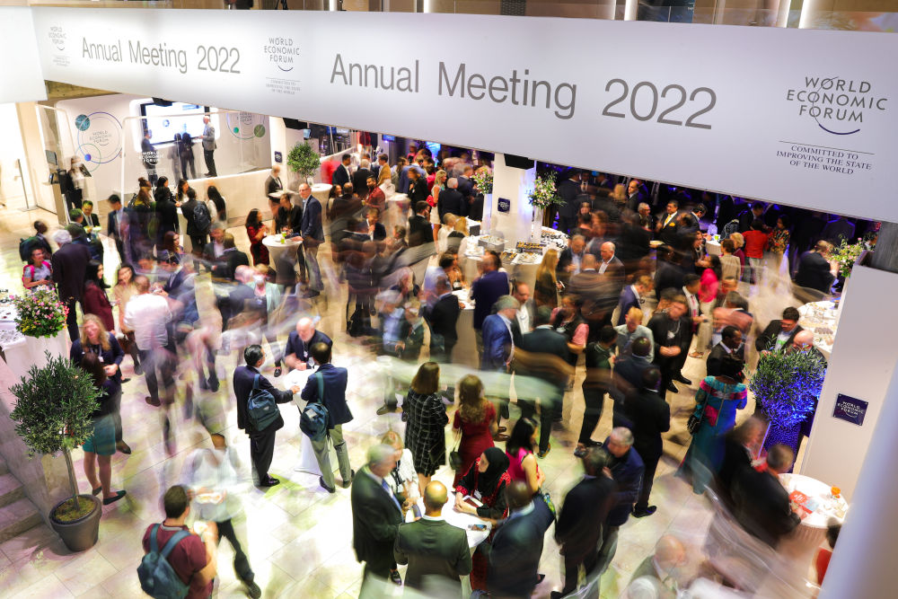 2022年5月22日,人们在瑞士达沃斯世界经济论坛年会会议中心参加欢迎招待会。