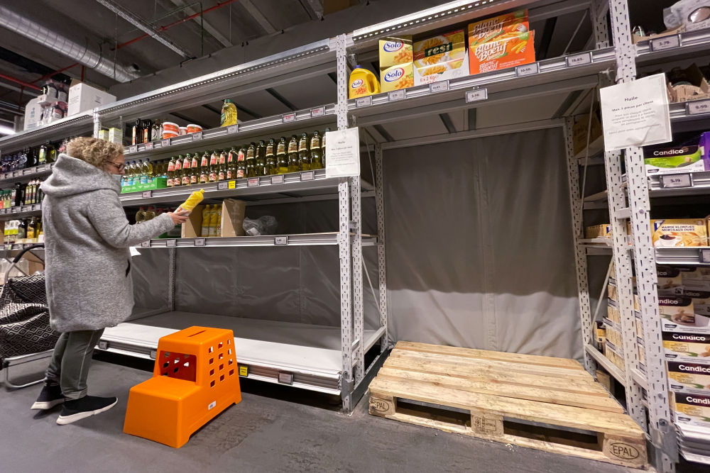 2022年3月29日,顾客在比利时布鲁塞尔的一家超市选购食用油。该超市食用油供货紧张,每位顾客限购两件。